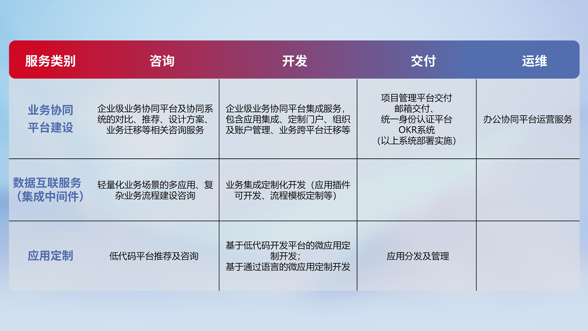 针对钉钉、、、企微、、、IDaas等平台级产品提供产品的规划、、、、方案、、、交付、、定制化开发等服务,,实现如统一协同办公、、、智能客户服务、、、、混合会议管理、、、智能数据查询、、、、等业务场景,,实现数字化转型。。。。